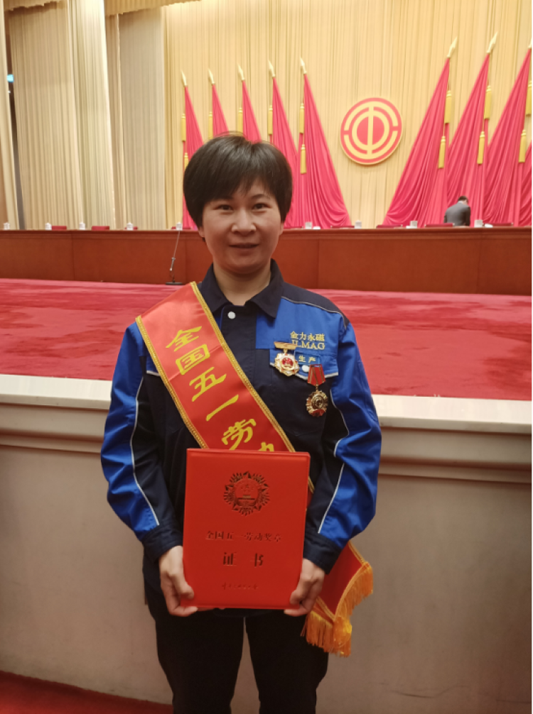 On the morning of April 27, the 2021 International Labor Day Celebration and the Mobilization Meeting of the Theme Labor and Skills Competition of "making contributions to the 14th five-year-plan and forging ahead for a new journey" were solemnly held in the Great Hall of the People in Beijing. Wen Xiaozhen, operator of block production process at JL Mag Rare-Earth Co., Ltd., won the National May 1st Labor Medal and was commended in Beijing.