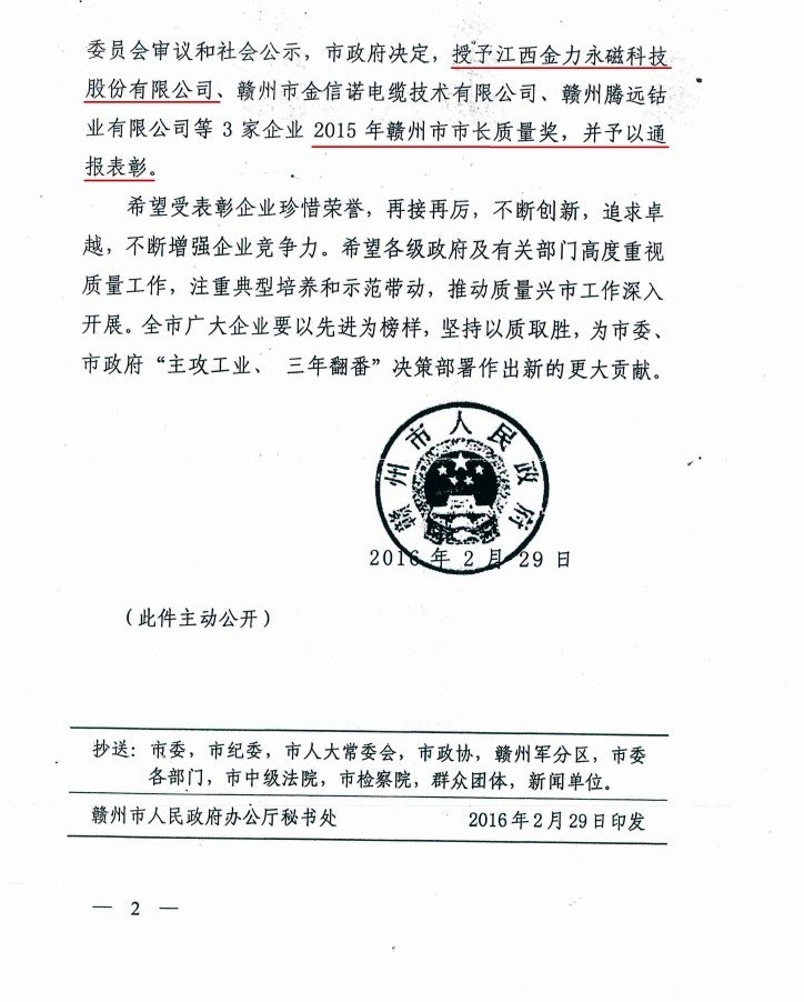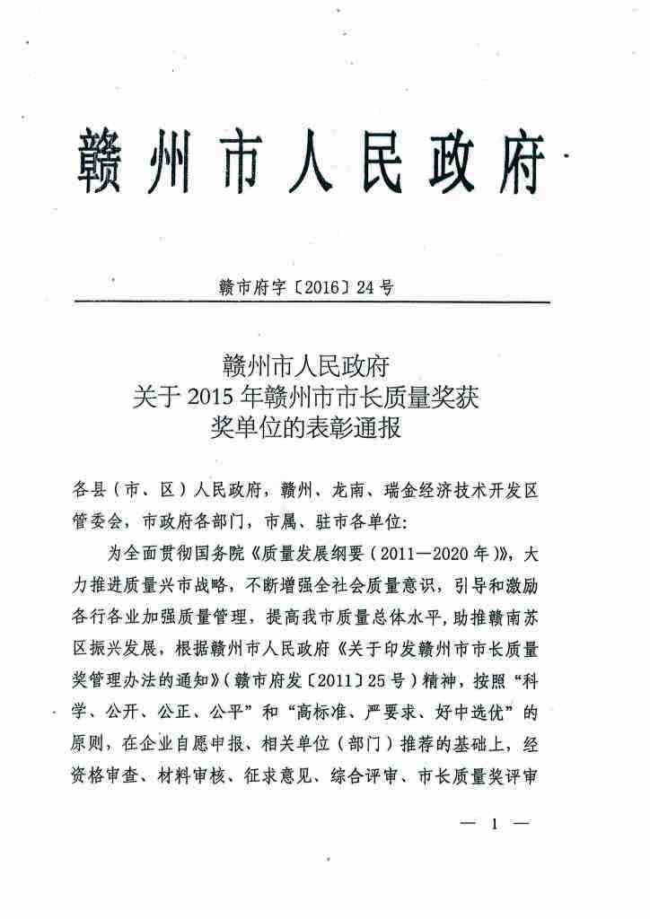 伟德国际1946荣获2015年赣州市市长质量奖