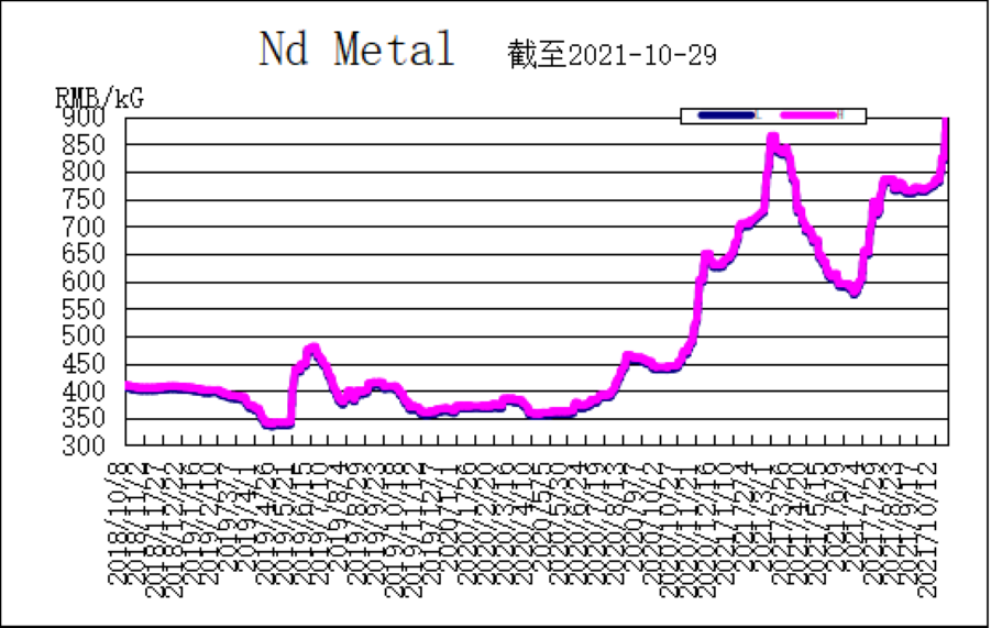 This week, prices of PrNd, Nd metal, Tb and DyFe have a slightly rise. Prices from Asian Metal at the end of this weekend presented: PrNd metal 875-885 RMB/KG, Nd metal 915-925 RMB/KG, DyFe alloy 2,830-2,850 RMB/KG, and Tb metal 12,250-12,300/KG.