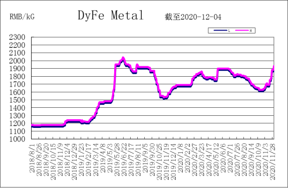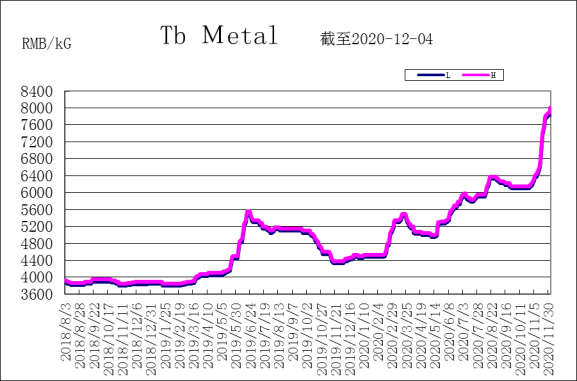 DyFe alloy 1,910-1,930 RMB/KG, and Tb metal 7,950-8,000RMB/KG.