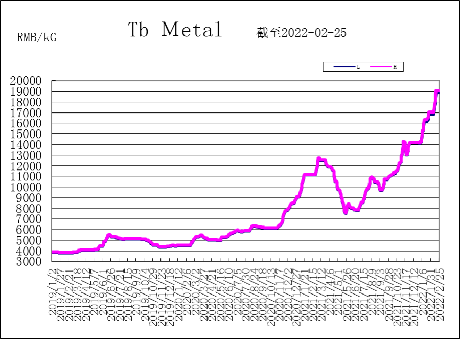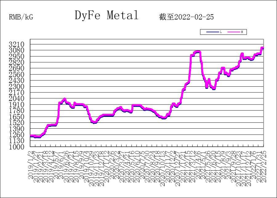 "Looking for magnetic materials" price presented: PrNd metal 1,340-1,350 RMB/KG; Nd metal 1,470-1,480 RMB/KG; DyFe alloy 3,120-3,140 RMB/KG; Tb metal 19,000-19,200 RMB/KG.