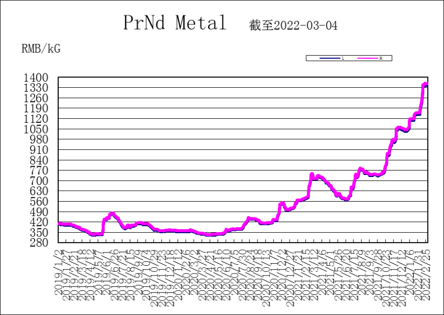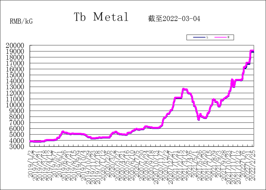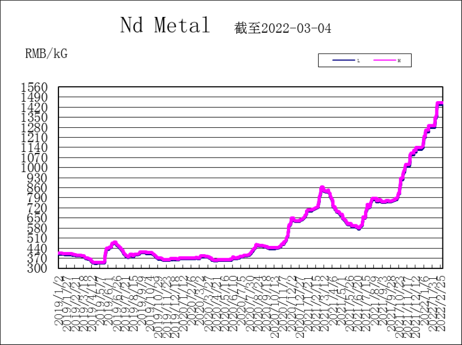 "Looking for magnetic materials" price presented: PrNd metal 1,350-1,360 RMB/KG; Nd metal 1,470-1,480 RMB/KG; DyFe alloy 3,100-3,120 RMB/KG; Tb metal 19,000-19,200 RMB/KG.