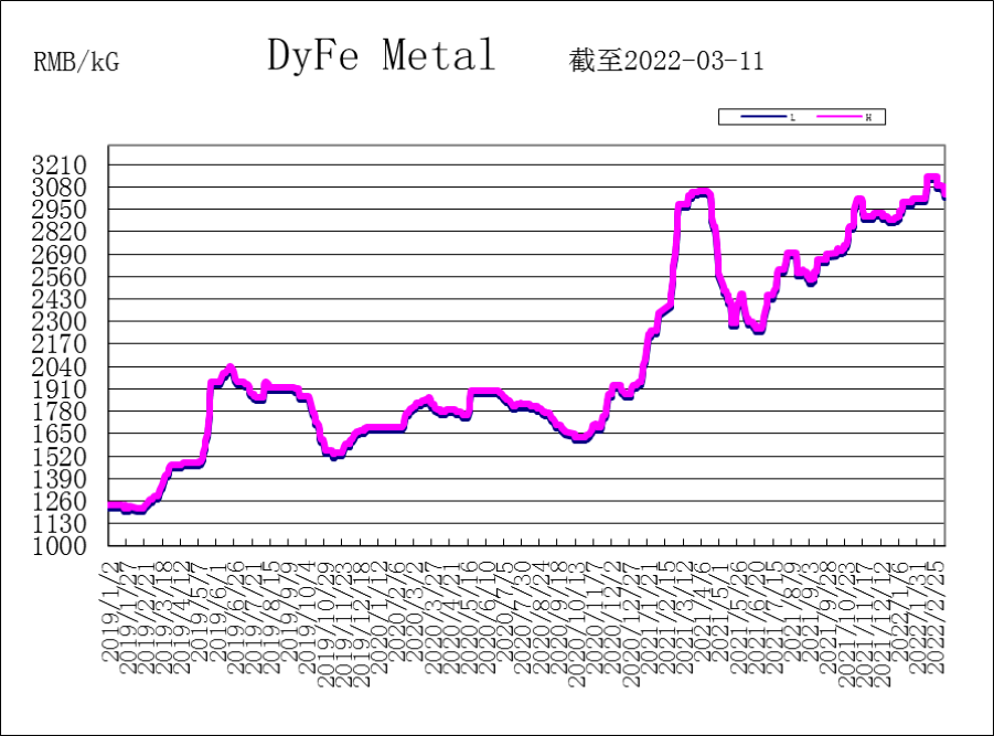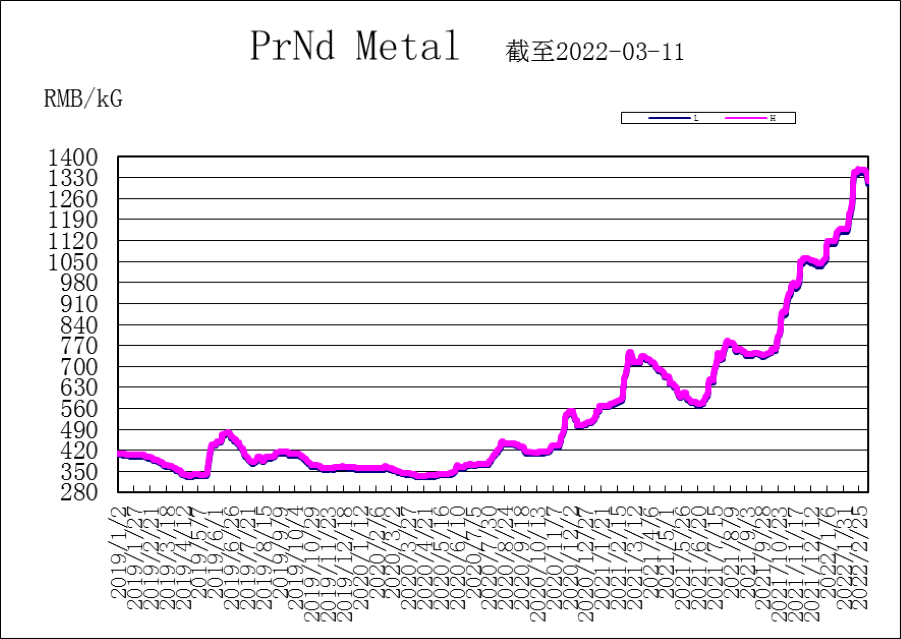 "Looking for magnetic materials" price presented: PrNd metal 1,330-1,340 RMB/KG; Nd metal 1,440-1,450 RMB/KG; DyFe alloy 3,050-3,070 RMB/KG; Tb metal 18,900-19,100 RMB/KG.